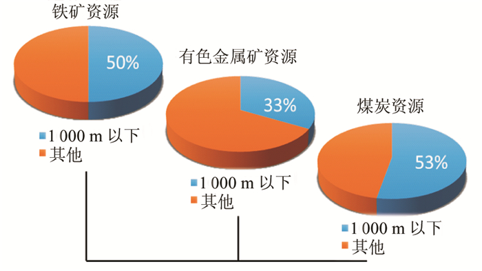 1 国内外深部资源开采发展现状 1.1 深部资源开采趋于常态目前世界上主要矿业大国相继进入深部开采,超过1 000 m的矿井已有100余座,分布在南非、加拿大、德国、俄罗斯、波兰等国家,其中以南非最具代表性。2004年,中国千米深井仅有8处;2015年,全国千米深井已达80余座。就煤矿而言,中国1 000 m以深的煤炭资源量占已探明煤炭资源总量的53%[2-3],而煤炭开采深度以每年10~25 m的速度延伸[4];目前全国煤矿千米深井约47座,平均采深1 086 m,如江苏徐州矿物集团的张小楼矿 (1 100 m)、河北唐山开滦集团的赵各庄矿 (1 159 m)、北京矿务局门头沟矿 (1 008 m),其中最深的为山东省新泰市新汶集团的孙村煤矿1 501 m[5-6]。德国、波兰、俄罗斯、英国、日本、比利时等国家的最大煤矿开采深度早在20世纪90年代就已超过1 000 m,逼近2 000 m水平[6]。就金属矿而言,国外开采超千米深的金属矿逾80座:南非绝大多数金矿开采深度在2 000 m以深,如姆波尼格金矿延伸至4 350 m[1, 7];加拿大金属矿已经进入超2 000 m,逼近3 000 m水平,如蒂明斯市的Kidd铜锌矿开采水平为2 800 m[8];印度金属矿开采深度将全面进入2 000~3 500 m水平,如钱皮恩里夫金矿总深达到3 260 m;俄罗斯金属矿开采也即将进入2 000~2 500 m水平[9]。中国金属和有色金属矿山将全面进入1 000~2 000 m深度开采阶段,目前全国金属矿千米深井约32座,如云南的会泽铅矿 (大于1 300 m)[10]、河北寿王坟铜矿 (1 000 m)、安徽铜陵的冬瓜山铜矿 (大于1 000 m) 等,其中最深的为辽宁抚顺的红透山铜矿1 600 m。另外,中国有一批即将开发的千万吨级特大型金属矿山,其开采深度超过1 000 m。因此,综合中国煤矿、金属矿开采深度水平的现状,可以看出,中国深部矿产资源开采将全面进入1 000~2 000 m阶段,深部开采趋于常态。如图 1所示,未来10到15年,铁矿资源的50%、有色金属矿资源的33%、煤炭资源的53%将进入1 000 m以下开采。