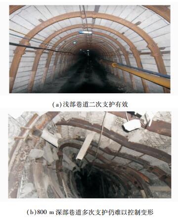 以煤炭开采为例,新汶矿区平均采深超过1 000 m,最深达1 501 m;1 150 m深时,最大水平主应力大于34.6 MPa。在该矿区巷道埋深小于800 m时,传统岩石力学的二次支护理论与方法适用,巷道支护分两次进行,即先柔后刚,先让后抗;而当巷道埋深大于800 m时,采用二次支护已不适应,出现较严重变形破坏,需要3次、4次支护甚至多次支护 (图 2),可见浅部巷道支护理论与方法在深部条件下失效。此外,深部开采煤岩体多尺度多因素相互作用关系、含瓦斯煤岩体力学-渗流响应、围岩破坏形态与控制、地下水保护等涉及深部煤炭安全绿色开采相关基础理论问题,尚缺乏系统研究和认识,亟需深入系统地开展深部煤矿安全绿色开采理论与技术研究,从而使中国深部煤炭由目前的安全高效开采向安全绿色开采转型,实践绿色开采理念[53-55]。