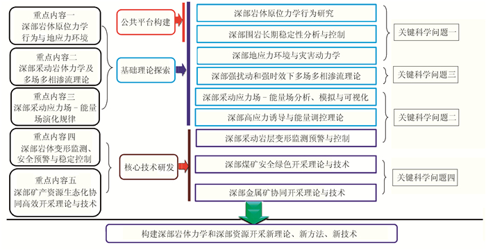 四大关键科学问题、五大重点研究内容和九大前沿方向的逻辑关系,以及深部岩体力学与开采理论研究体系见图 3。
