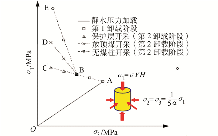 4) 基于深部开采扰动应力路径的岩石力学理论。传统的岩石弹塑性力学理论研究均属基于加载试验的宏观唯像理论,而非全应力空间路径力学行为理论。深部资源开采活动实际上是“高应力 (地应力)+动力扰动 (开采卸压)”双重作用的力学过程。因此,需要开展基于深部开采扰动应力路径的动静组合加卸载试验,从能量角度出发分析在不同开采扰动应力路径下岩石的破坏规律与机理,室内试验尺度下还原并捕获开采扰动作用下岩石破坏全过程,从而建立开采扰动作用下岩体动力灾害致灾判据。如图 4所示,3种典型开采方式的扰动应力路径为基于深部开采扰动应力路径的岩石力学理论研究迈出了第一步[69]。