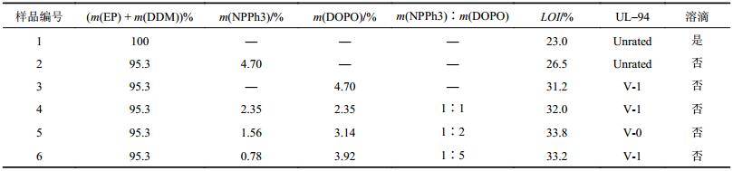 3)EP/NPPh3的LOI值从23%提高到26.5%,UL–94测试结果为无级别,当NPPh3和DOPO进行复配,NPPh3和DOPO的质量比为1∶2时,LOI值达到33.2%,UL-94通过V-0级别。