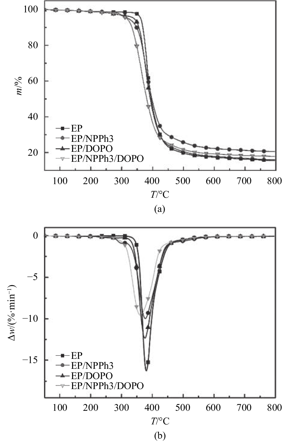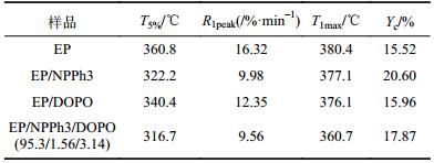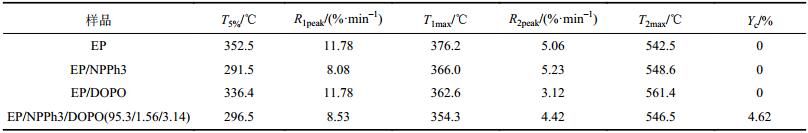 图6为EP、EP/NPPh3、EP/DOPO、和EP/NPPh3/DOPO(95.3/1.56/3.14)体系在氮气条件下的TG和DTG曲线图,表2所示为对应的热失重曲线的数据。其中T5%为失重率达5%时的温度,为样品的初始分解温度;Tmax为最大热分解温度;Rpeak为最大热分解速率;Yc为800 ℃下的残炭量。由图6(a)可知,氮气条件下,环氧树脂分解过程一步完成,初始分解温度为360.8 ℃,800 ℃下残炭量为15.52%。NPPh3的加入使得环氧树脂的初始分解温度提前,这主要由于阻燃剂NPPh3中的有热稳定性较差的P–C键,该键受热容易发生断裂[10]。另一方面,NPPh3在环氧燃烧之前分解,有利于保护环氧树脂,起到阻燃作用。此外,由图6(b)可以看到,EP/NPPh3热失重速率相比于EP降低,EP/NPPh3在800 ℃下残炭量为20.60%,比EP高出5.08%,说明NPPh3的加入可以延缓环氧树脂的降解,且能有效提高它的成炭能力。EP/DOPO初始分解温度为340.4 ℃,残炭量为15.96%,较EP来说,体系残炭量几乎没有提高。当NPPh3和DOPO共同作用于环氧树脂时,可以看到,EP/NPPh3/DOPO初始分解温度较NPPh3和DOPO单独作用在EP时要低,且其最大热分解速率的值也低于EP,EP/NPPh3,EP/DOPO体系,说明DOPO的存在改变了NPPh3的降解方式。