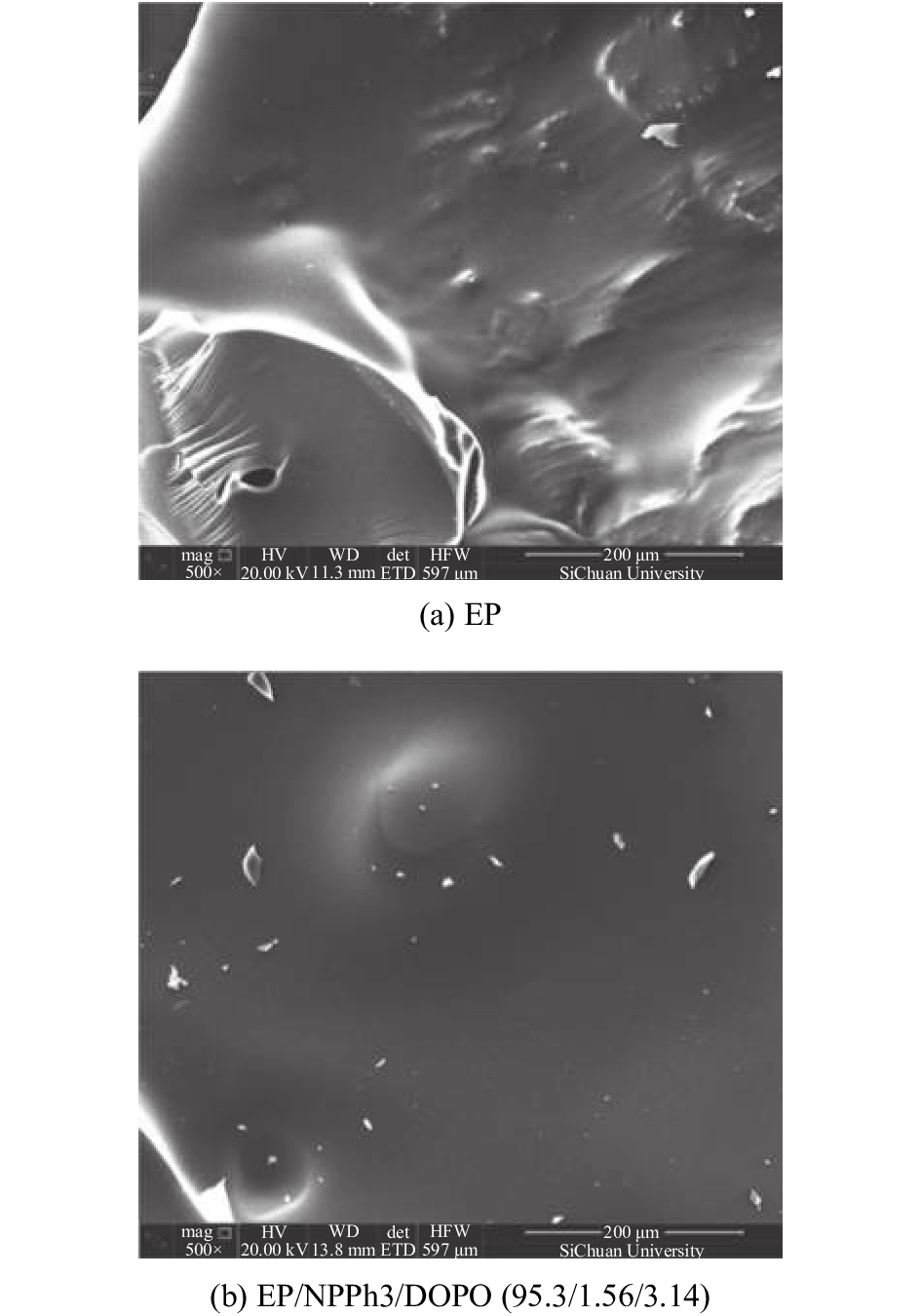 图10分别为阻燃体系EP和EP/NPPh3/DOPO(95.3/1.56/3.14)燃烧后表面SEM形貌。从图中可以看出,纯环氧树脂燃烧后的炭层,表面呈现很多凸起,不是很平整。添加了NPPh3/DOPO的体系的残炭,表面更致密且光滑,这样的炭层能够起到更好的隔绝可燃气体和热量传递的作用,从而保护环氧基体不被进一步的燃烧和分解,这样就提高了阻燃环氧树脂的氧指数和高温残炭量,使该体系在垂直燃烧测试中通过了V-0级[15]。