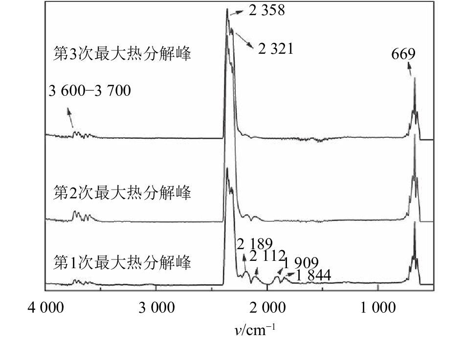 图4为NPPh3空气条件下挥发物在最大热分解速率下的红外光谱图,从图4中可以看到挥发气体主要为H20(3 600~3 700、1 909和1 844 cm–1),CO2(2 358和2 321 cm–1)、CO(2 189和2 112 cm–1)和芳环(669 cm–1),主要来源于NPPh3热分解过程中苯环的断裂。气相红外并没有发现含P,N官能团的特征峰,说明NPPh3内P,N元素残留在凝聚相内。