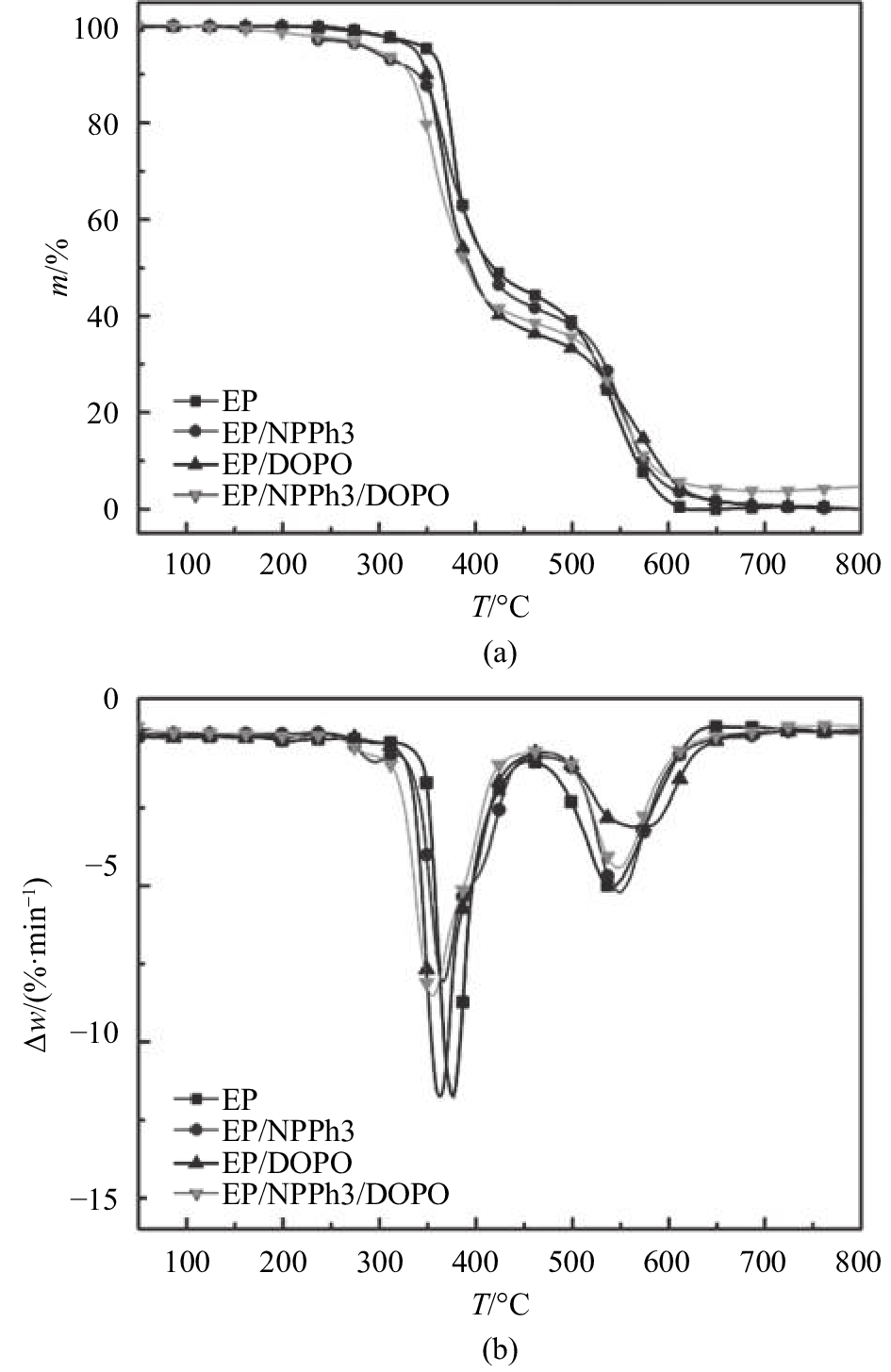 | 图6 氮气气氛下EP、EP/NPPh3、EP/DOPO、EP/NPPh3/DOPO(95.3/1.56/3.14)的TG和DTG曲线 Fig. 6 TG and DTG curves of EP,EP/NPPh3,EP/DOPO, EP/NPPh3/DOPO (95.3/1.56/3.14) in nitrogen atmosphere |