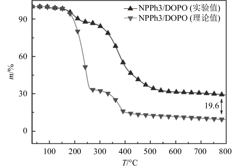 | 图8 NPPh3/DOPO(1∶2)体系实验和理论的TG曲线 Fig. 8 Experimental and theoretical TG curves of NPPh3/DOPO (1∶2) |