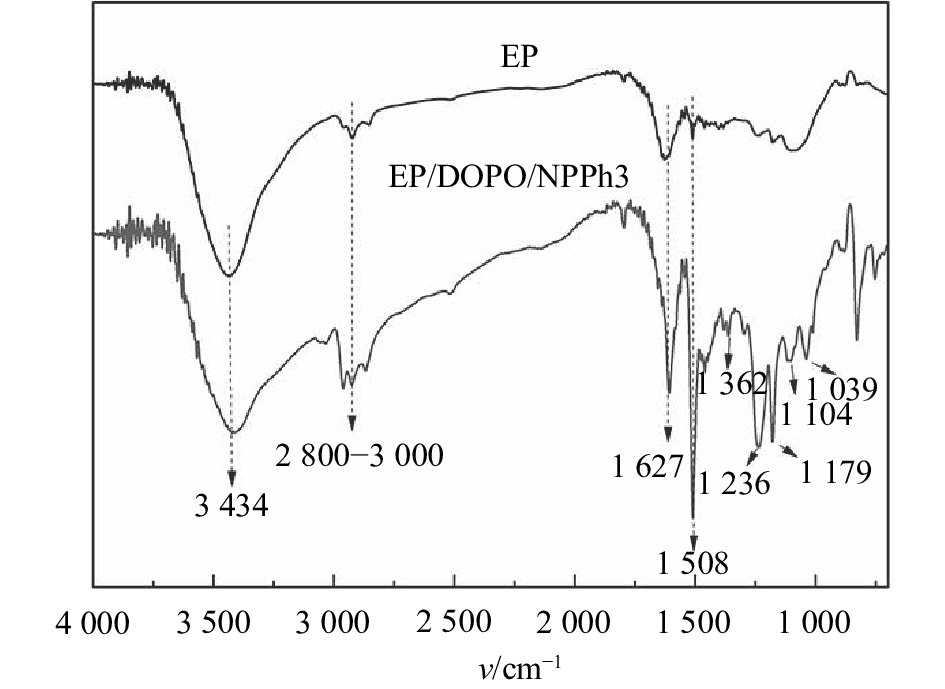 图9为EP和EP/NPPh3/DOPO(95.3/1.56/3.14)UL–94测试后样品表面残留物的红外谱图。从图可知,EP的残炭红外吸收峰主要为3 434、2 800~3 000、1 627和1 508 cm–1。其中3 434 cm–1对应为–OH,2 800~3 000、1 627和1 508 cm–1为苯环的伸缩振动吸收峰。相比于纯环氧树脂,除了以上几个吸收峰外,在EP/NPPh3/DOPO中还观察到–NO2(1 362 cm–1)的振动吸收峰,表明燃烧后,NPPh3中的硝基基团留在了残炭中,发挥凝聚相阻燃作用。1 236 cm–1对应为–P=O的伸缩振动吸收峰,1 179、1 104 和1 039 cm–1为–P–O基团的特征峰,这是由于聚合物燃烧时,含磷键受热分解,与空气中的氧气发生反应生成磷酸等物质。该物质覆盖于未燃材料表面,可隔热隔氧,起到阻燃作用[14]。