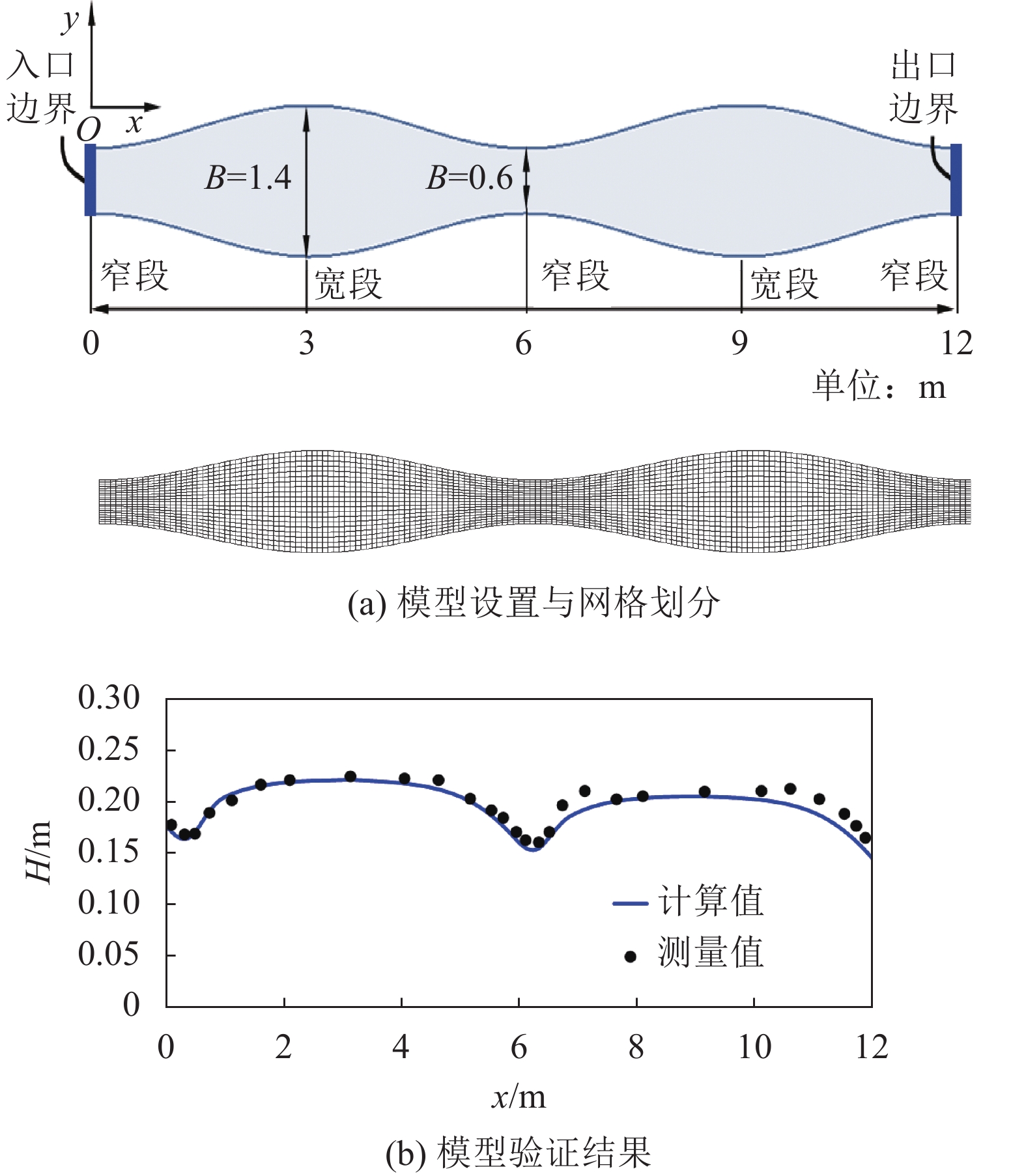 $ {C_{1\varepsilon }} = 1.44 $ ,$ {C_{2\varepsilon }} = 1.92 $ ,$ {\sigma _k} = 1.0 $ ,$ {\sigma _\varepsilon } = 1.3 $ ,$ {C_{\varepsilon \beta }} = 3.6 $ ,$ {C_\varepsilon } = 1.3 $ ,均为经验常数[21-22];${U_*} = \sqrt {{\tau _{\rm{b}}}/\rho }$ 为摩擦流速。数值计算利用浅水模型,采用贴体网格对计算区进行划分,并对控制方程进行相应的转换[23];采用有限差分法对控制方程进行离散求解;采用3阶显性CIP算法进行插值,精度高,稳定性好[24-25]。模型验证利用河段室内试验对沿程水位进行比较,水槽试验在四川大学水力学与山区河流开发保护国家重点实验室进行,具体可参考文献[2]。平面几何形态及网格划分如图1(a)所示。水槽坡度S=0.002,最宽段宽度B = 1.4 m,最窄段宽度b = 0.6 m,宽窄段间距为3 m,并采用正弦曲线衔接。入口边界条件采用流量边界Q=0.1 m3/s,出口边界条件采用水位边界Hd= 0.148 m,水槽壁面为光滑水泥面,曼宁系数设为0.02,模型验证结果如图1(b)所示。数值计算的水位沿程变化与试验值较为一致,误差率±2.5%,表明该2维浅水模型及网格系统对于宽窄相间河道水流运动模拟具有良好的效果。此外,经过网格收敛性分析,计算结果已经收敛。