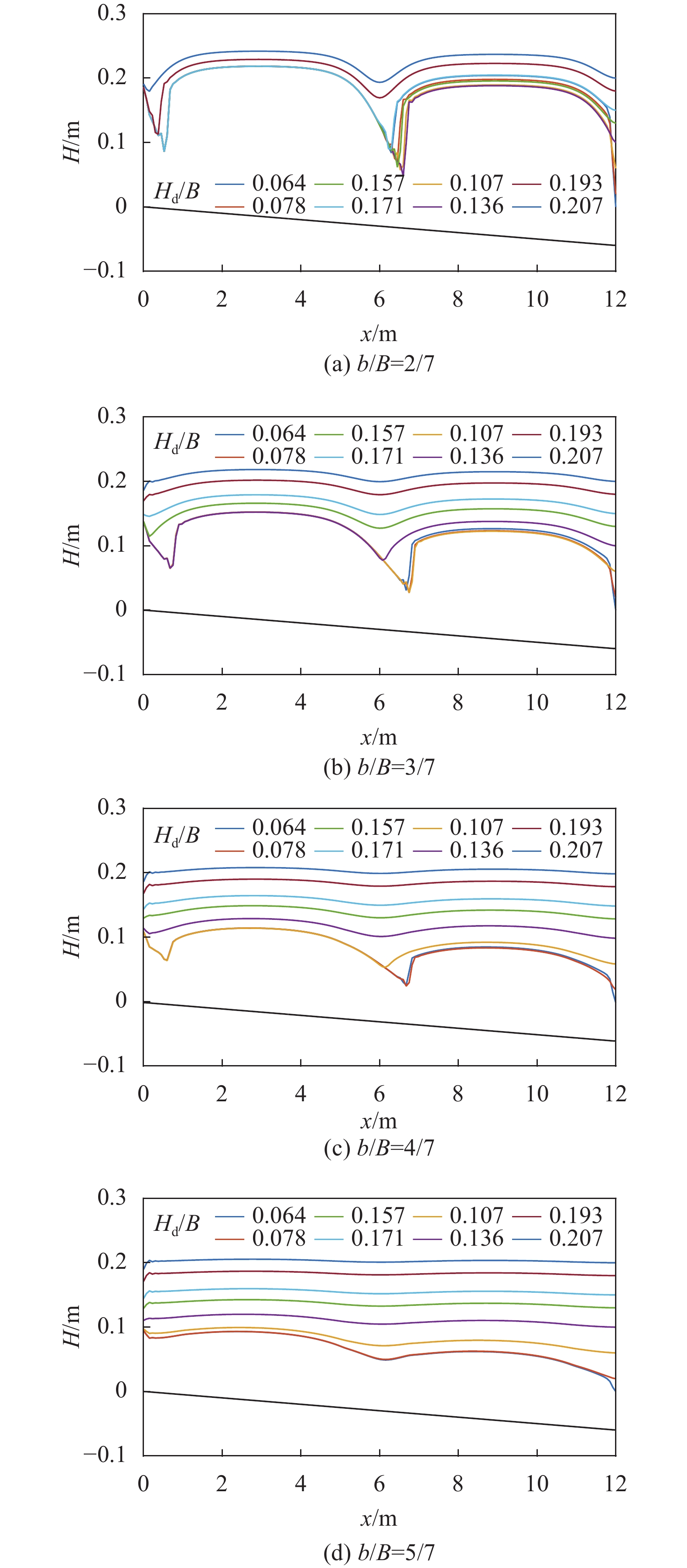 图2为窄宽比变化条件下断面平均水位沿程H的分布与出口水位的关系。