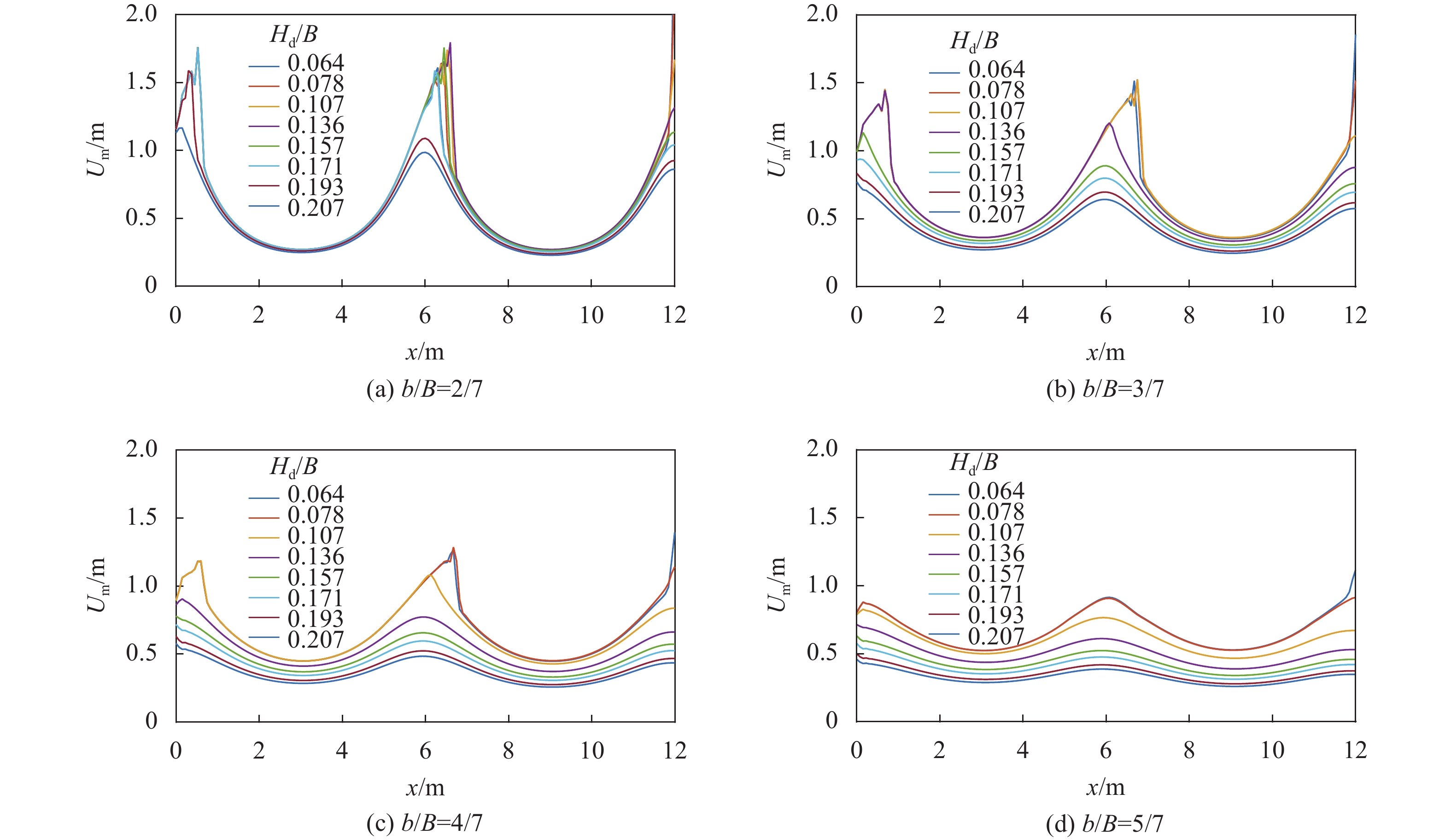 由于计算过程保持流量不变,因此,断面平均流速主要由水位决定,水位越大,流速越小。图3为不同工况下的断面平均流速Um沿程分布。可知:断面平均流速沿程分布基本与水位分布规律相反。全局高流速始终出现在窄断面附近,即:如果产生水跃,最高流速则出现在最窄段下游,对应水跃位置;如果未产生水跃,最高流速则出现在最窄断面。窄宽比越小,宽、窄段流速差异越大(特别是宽段),且对下游出口水位变化不敏感,表明平面边界形态效应突出;窄宽比越大,下游水位效应的主导作用越显著。河宽缩窄整体上表现为输水能力明显降低,即宽段断面流速在下游低水位时大幅降低,则相同流量对应的水位更高,而这一输水降低效应随着下游水位的增大而差异变小。此外,窄段河宽越小,最高流速越大,特别是产生水跃现象之后,这表明窄段河床冲刷越大;此时宽段流速较低,窄段冲刷出的泥沙较易淤积在宽段,形成深潭–浅滩结构。在大水深条件下,窄段流速明显降低,上游泥沙可能会重新淤积于窄段。