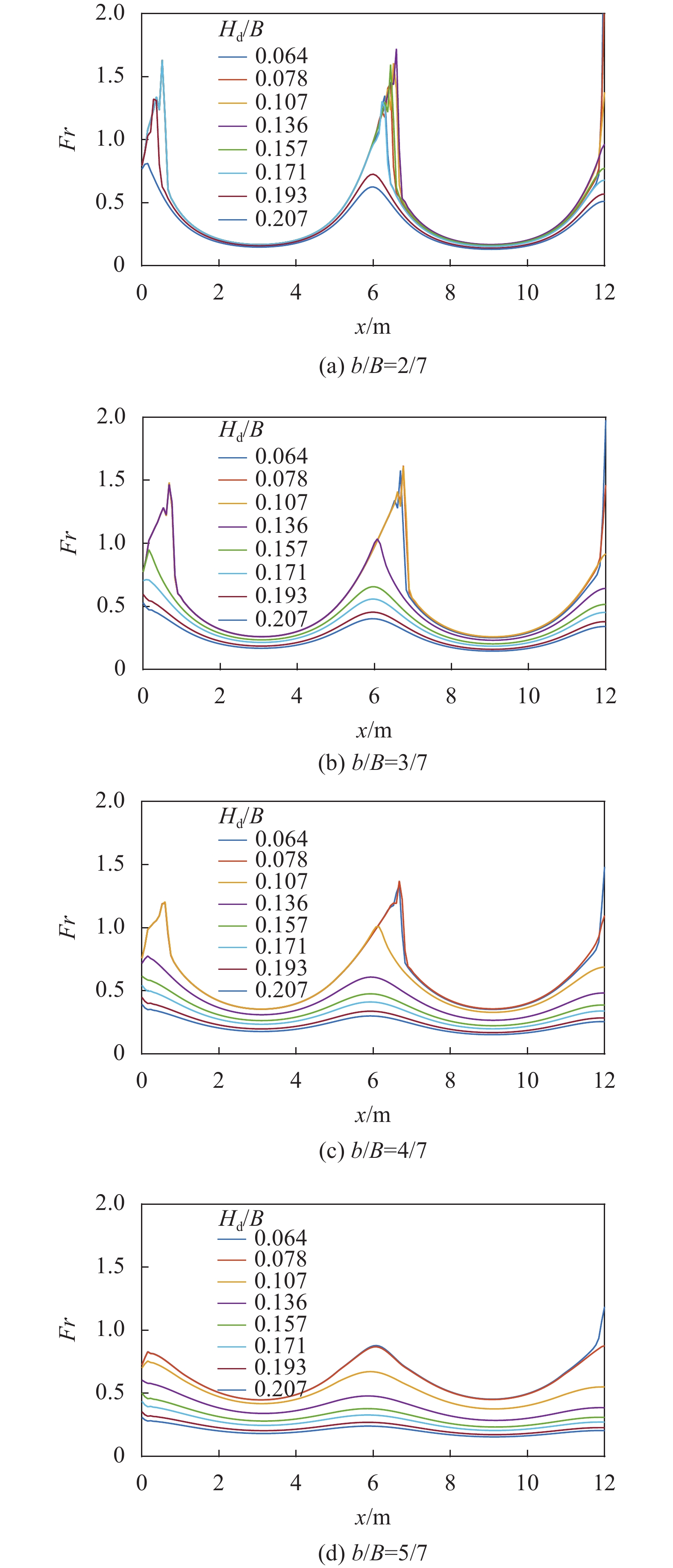 利用验证后的模型研究窄宽比和下游出口水位对宽窄相间河道水流特性和输水能力的影响,设计不同数值试验工况进行敏感性分析。以验证工况为基准,保持流量和最宽段宽度不变,即Q=0.1 m3/s,B=1.4 m。通过改变窄段最小宽度b和下游出口水位Hd,研究窄宽比(b/B)变化与下游水位(Hd/B)效应对宽窄相间河道水流特性的影响。设计7个窄宽比和8个不同水位,共56组试验工况。