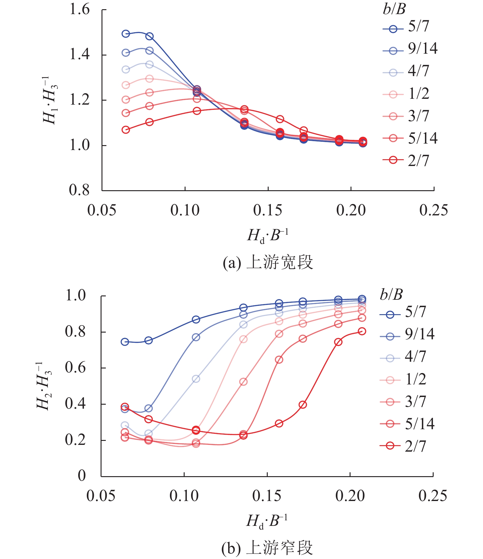 宽窄相间河道存在宽段高水位、窄段低水位等特征水位,其水位分布特征受窄宽比和下游水位共同影响。通过分析其相关性,有助于理解宽窄相间河段上下游水位沿程分布规律。利用下游宽段水位(H3)对上游宽、窄段特征水位(H1、H2)进行无量纲化,可以得到上游宽、窄段特征水位与下游宽段特征水位比(H1/H3、H2/H3)。图5(a)为在高窄宽比条件下,上下游宽段特征水位比(H1/H3)随下游出口水位的变化曲线,可知:H1/H3随下游出口水位(Hd/B)的增大而降低,表明上下游河道因水位上涨形成了壅水效应;在低窄宽比条件下,H1/H3整体上接近于1,表明在出口低水位条件下,因河宽缩窄出现壅水效应,但随下游出口水位的变化幅度不大。此外,低窄宽比条件下,H1/H3随下游出口水位的增大呈现先增大后减小的趋势,表明低窄宽比宽窄相间河道可能存在最优输水效率。图5(b)为在低窄宽比条件下,上游窄段与下游宽段特征水位比(H2/H3)随下游出口水位的变化,可知:H2/H3先随着下游出口水位的增大而几乎保持不变甚至减小;超过一定水位之后,H2/H3随出口水位的继续增大而显著增大。前者表现为水跃出现的水力条件,后者则对应水跃消失的水力条件。