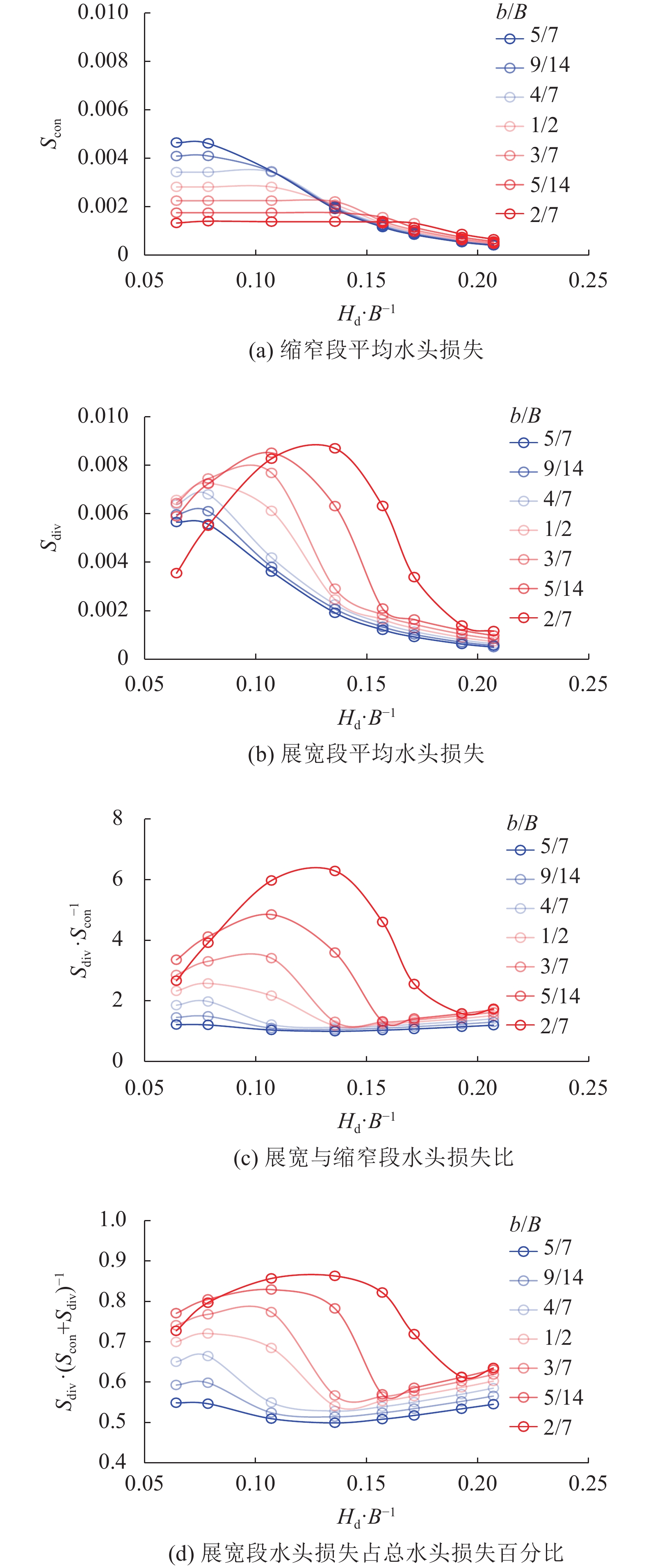 $$ \left\{ \begin{gathered} {S_{{\rm{con}}}} = \frac{{{H_{{\rm{tn}}1}} - {H_{{\rm{tw}}1}}}}{{{L_1}}}, \\ {S_{{\rm{div}}}} = \frac{{{H_{{\rm{tw}}2}} - {H_{{\rm{tn}}2}}}}{{{L_2}}} \\ \end{gathered} \right.\quad $$ (13) 式中,Scon、Sdiv依次为缩窄段、展宽段平均水头损失,L1、L2依次为缩窄段、展宽段长度。
